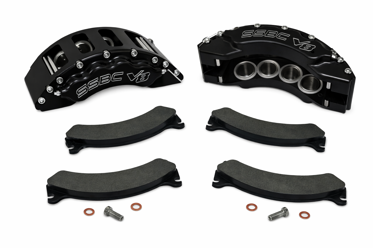The 8-piston aluminum calipers are a direct replacement for factory 2-piston front calipers. The SSBC-USA kit includes high-performance severe-duty brake pads, all necessary hardware and full instructions.